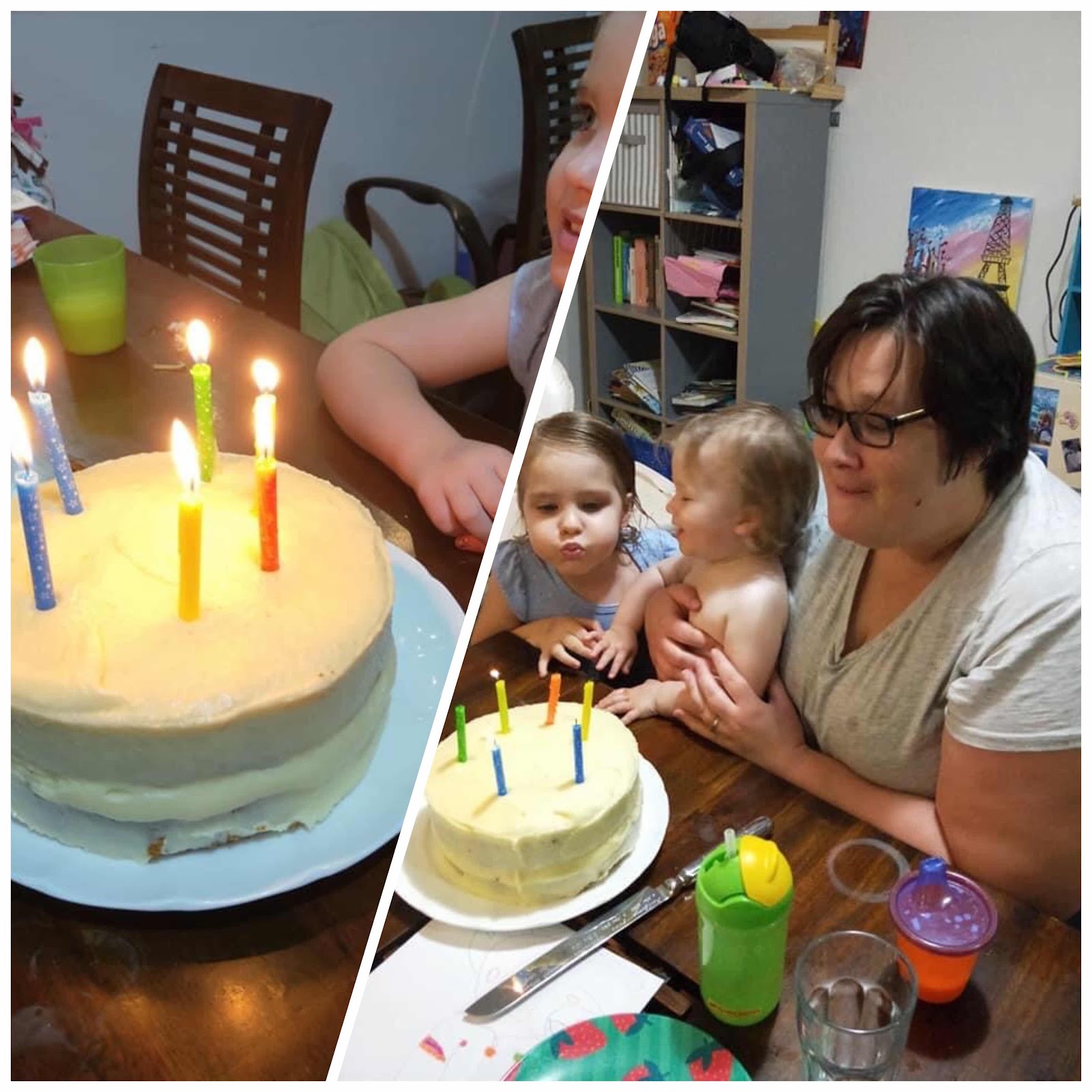 It was DsD2’s birthday in early April when no one was allowed visitors in their homes. Our son in law made a cake and the little family of 4 celebrated this event.